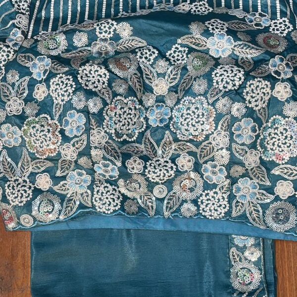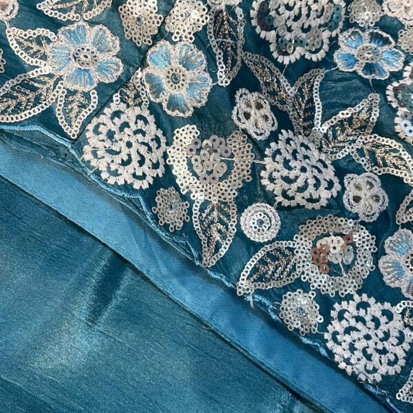 Teal Sequin Floral Embroidery Saree with Readymade Blouse & Extra Blouse Fabric