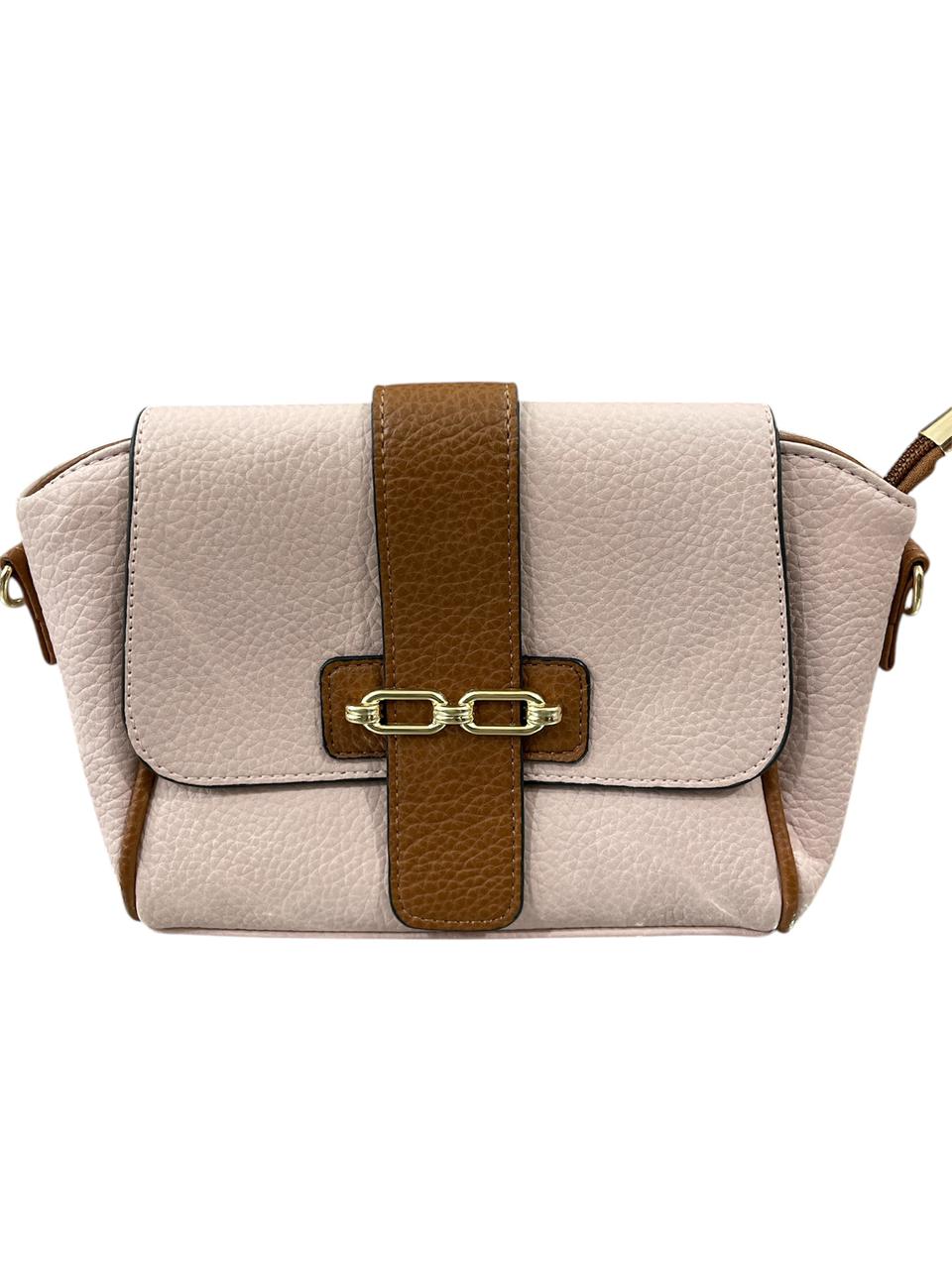 Elevate your everyday style with this chic and modern crossbody bag. Crafted from premium textured leather, it features a soft blush-toned body accented with rich tan leather trim for a timeless, sophisticated look. The front flap design is highlighted by a bold vertical leather strap and a gold-tone chain-link embellishment, adding a touch of elegance and luxury.