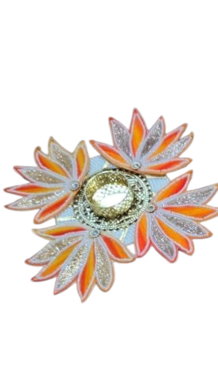 Add a radiant touch to your celebrations with this handcrafted orange and silver petal tealight candle holder. Featuring a golden center holder surrounded by vibrant orange and shimmering silver petal designs, this piece brings elegance and festivity to any setting. Perfect for Diwali, weddings, pooja décor, or as a centerpiece, it creates a warm glow that enhances the beauty of your home. A blend of traditional craftsmanship and modern design, this tealight holder also makes a thoughtful festive gift.
