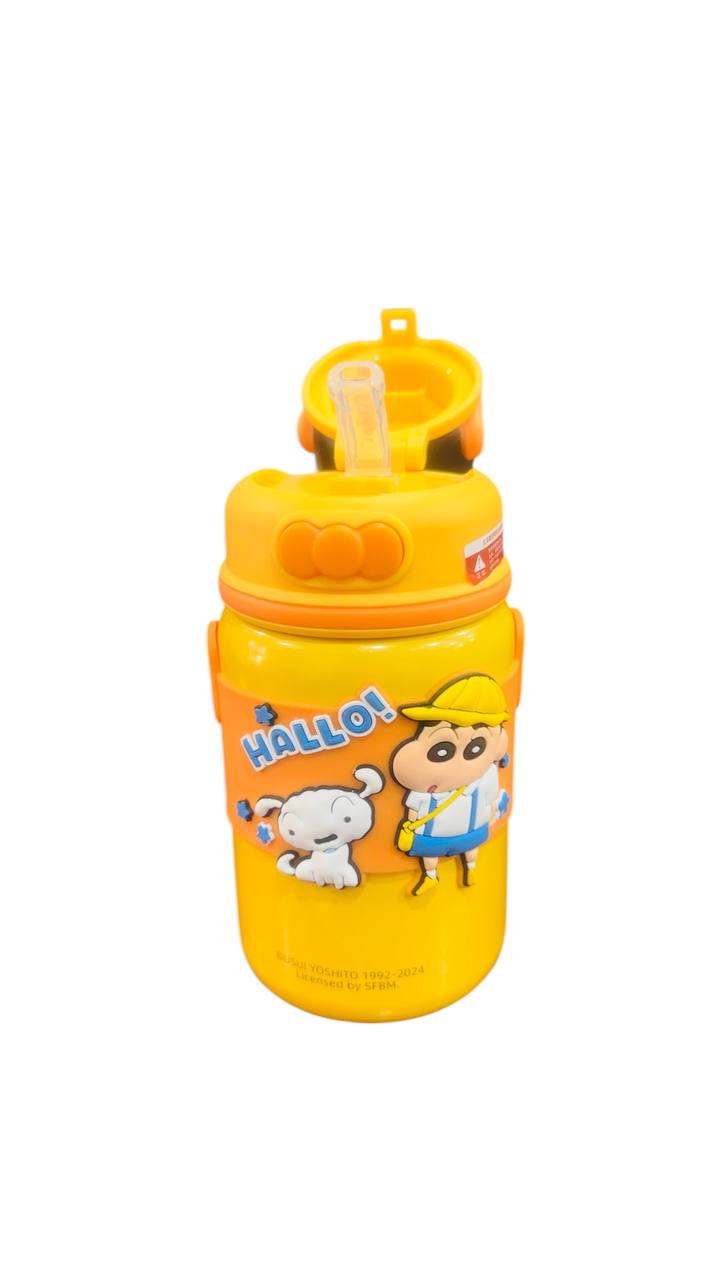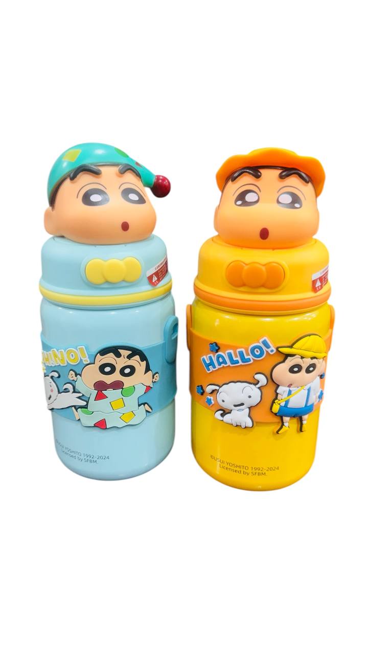 Protective Silicone Sleeve: The bottle is wrapped in a textured “HALLO!” sleeve featuring Shin-chan and his dog, Shiro, providing extra grip and impact protection.