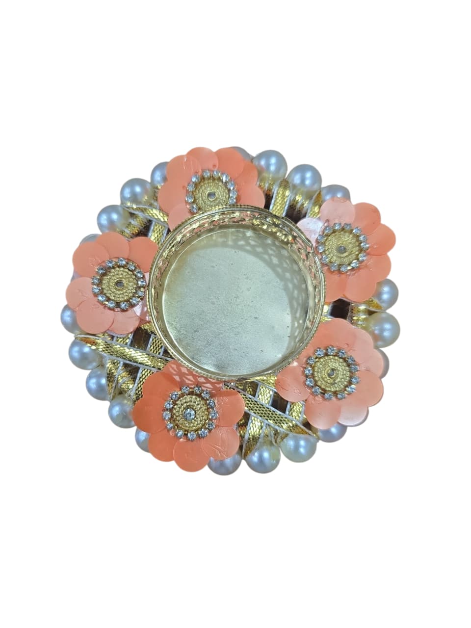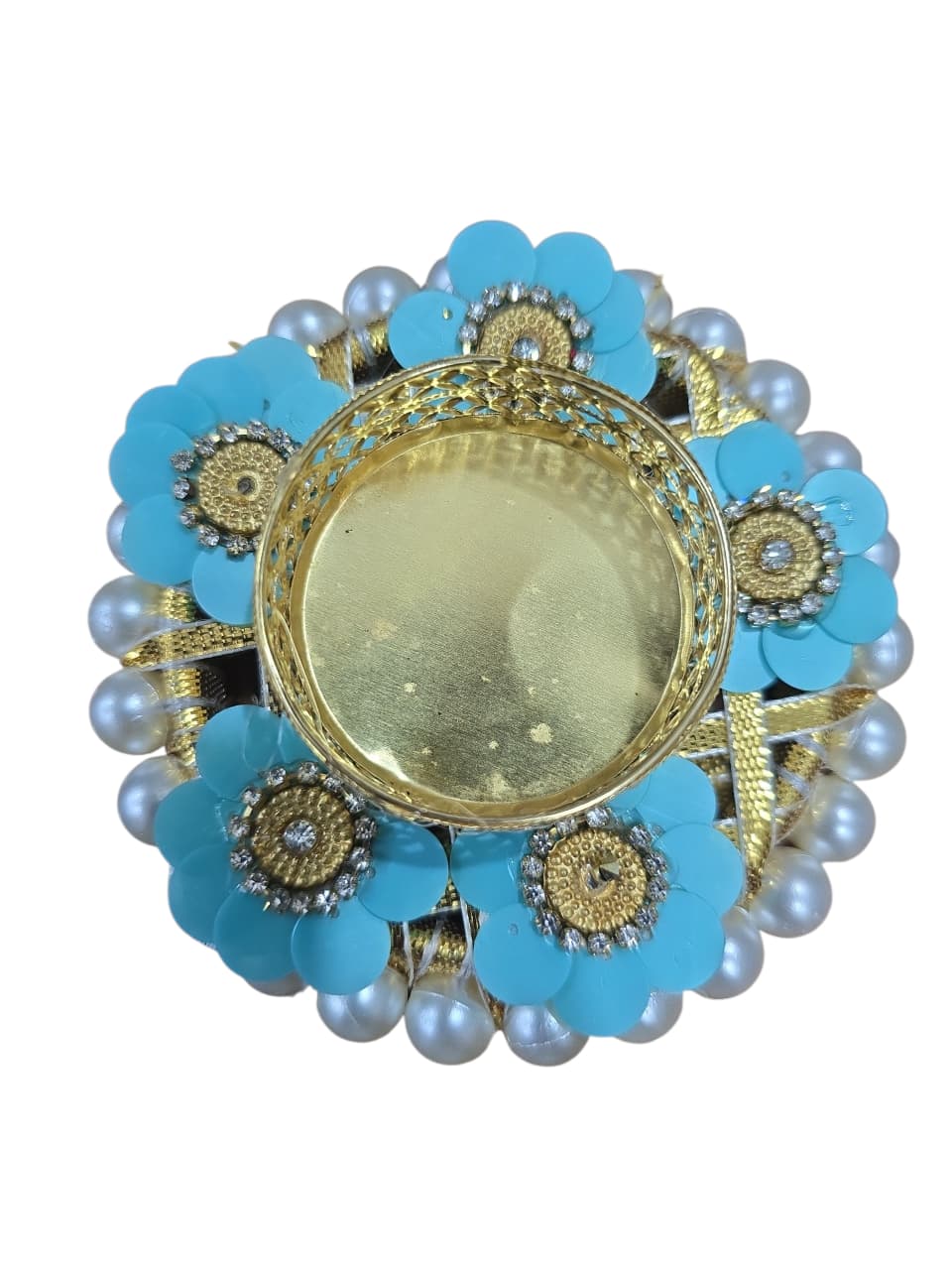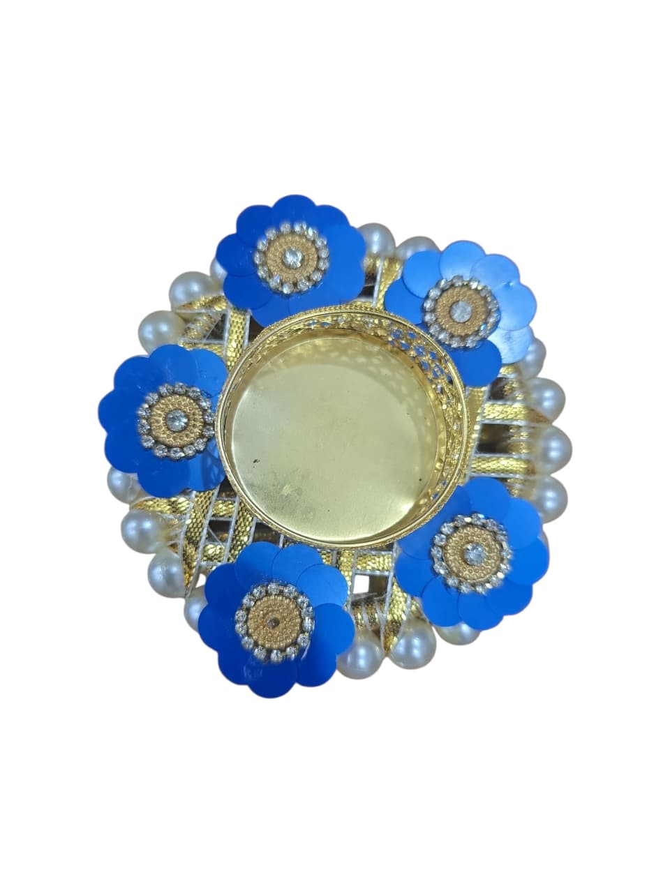 Add elegance to your home décor with this beautifully handcrafted tealight candle holder. Designed with vibrant blue floral accents and adorned with pearl detailing, this decorative piece is perfect for festive occasions, pooja décor, weddings, or as a centerpiece for your living space. The golden circular holder in the center securely holds a tealight candle, creating a warm and charming glow
