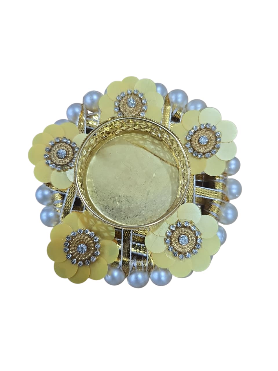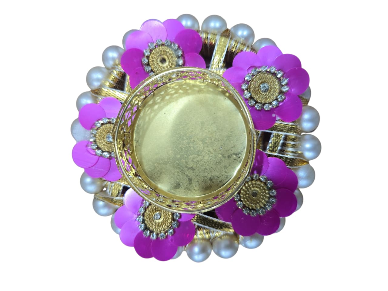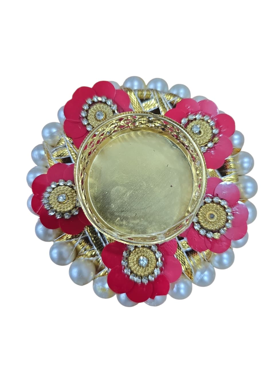 Add elegance to your home décor with this beautifully handcrafted tealight candle holder. Designed with vibrant blue floral accents and adorned with pearl detailing, this decorative piece is perfect for festive occasions, pooja décor, weddings, or as a centerpiece for your living space. The golden circular holder in the center securely holds a tealight candle, creating a warm and charming glow