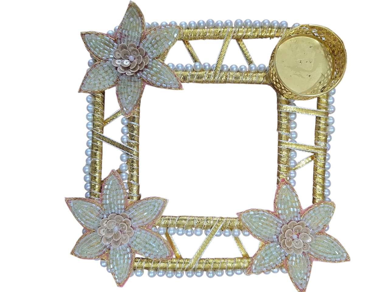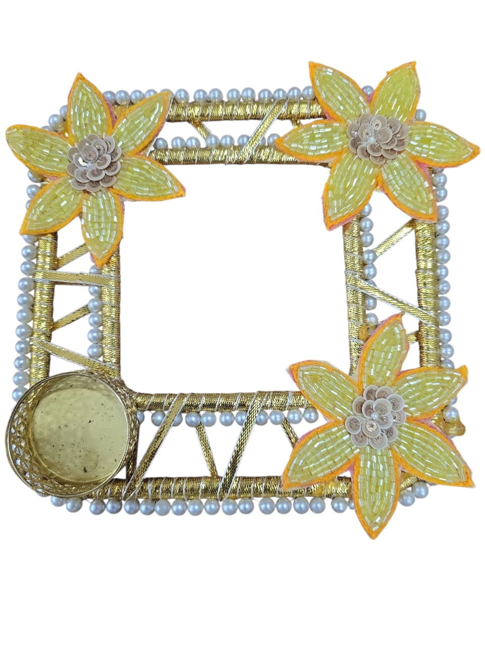 Brighten up your celebrations with this beautifully handcrafted yellow flower square tealight candle holder. Designed with vibrant yellow artificial flowers and a delicate pearl border, it adds a festive and elegant charm to any setting. The golden center holder secures the tealight, creating a warm and radiant glow. Ideal for festivals, pooja décor, weddings, or as a decorative centerpiece, this tealight holder makes a perfect addition to your home décor or a thoughtful gift for loved ones.